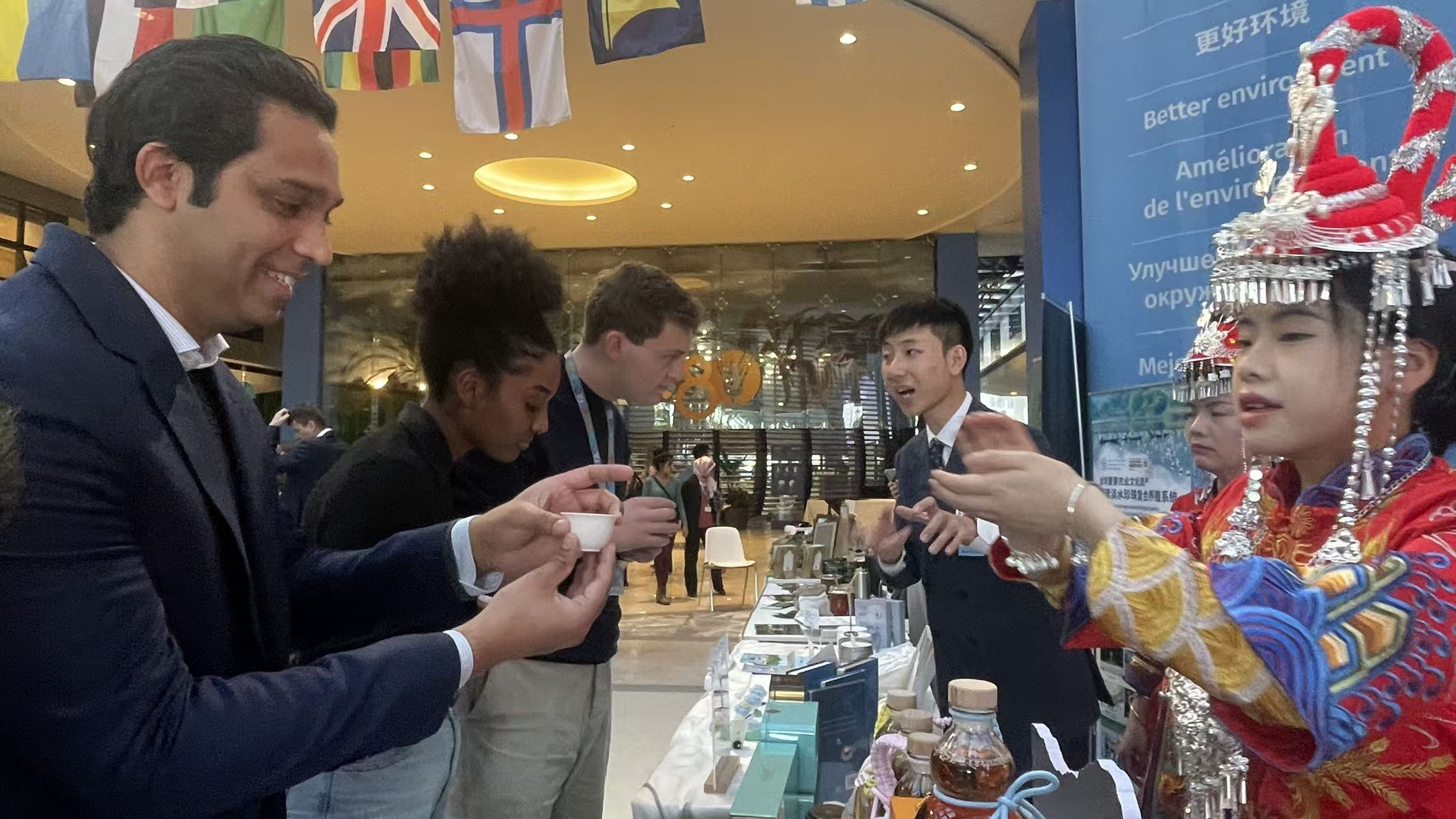 在福鼎白茶文化系统展区,浓郁的东方茶韵与沉浸式的文化体验吸引着参展人士的目光。品品香、绿雪芽、白茶山等茶企作为福鼎白茶代表,携“双世遗”福鼎白茶产品亮相,并向联合国粮农组织赠送白茶纪念砖和白毫银针。福鼎白茶非遗传承人、农遗守护人在现场进行科普讲解,吸引众多政要嘉宾前来品鉴来自世界原产地的福鼎白茶。身着畲族盛装的福鼎白茶仙子为嘉宾展示福鼎白茶冲泡技艺,生动展示了福鼎白茶文化系统作为全球重要农业文化遗产的独特魅力,让大家感受到满满的“农遗”元素。
