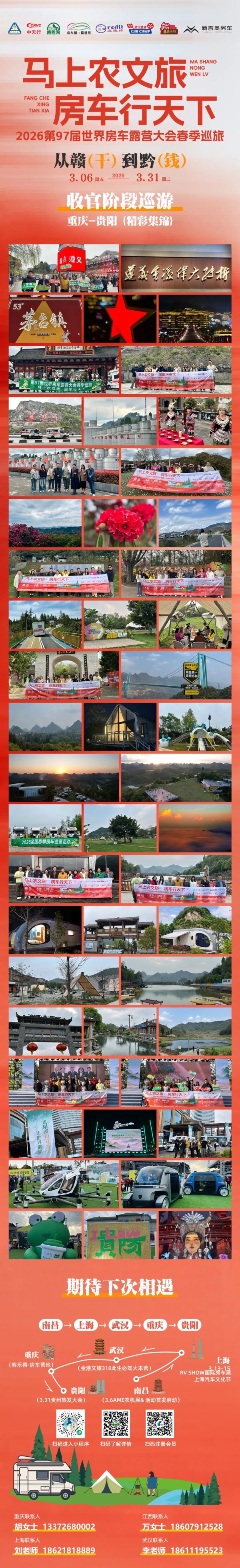3月6日至3月31日,从赣到黔的巡旅虽已按下暂停键,但精彩远未结束。下一站,5月22日 - 24日,第26届上海国际房车&户外展将在上海国家会展中心举行。同时,将持续重点推进发展百佳房车露营创新联合体会员、推介“马上农文旅”小程序、为客乐得旗舰店(重庆)玉峰山房车营地提档升级创AAAA景区、申报三新(新业态·新场景·新模式)项目招商等工作。2026年9月,第97届F.I.C.C.世界房车露营大会将在贵州·贵阳举行,届时将吸引全球数十个国家与地区的露营爱好者及行业代表齐聚,共襄行业盛事、共探发展新机。我们满心期待这场国际盛会的启幕,也期待以房车为媒,让更多人领略贵州的山水之美与文旅魅力。