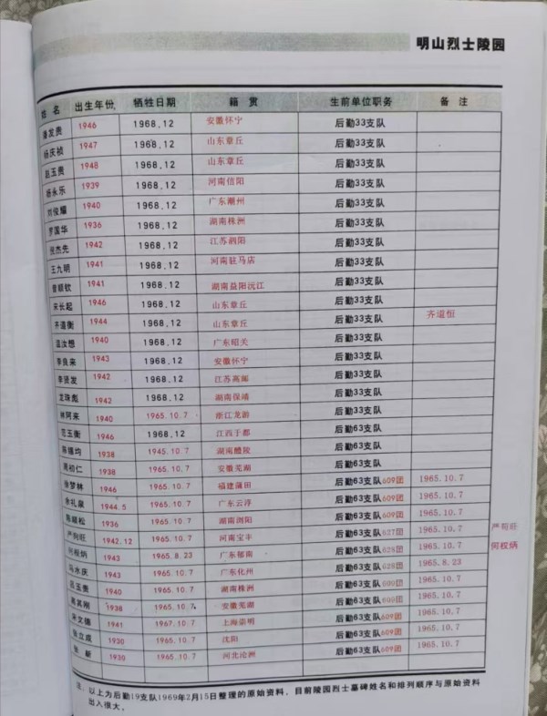 但是由于战时条件有限,部队频繁转移,加之时间久远。梅孝斌发现《中国援越抗战烈士名册》中有些烈士的姓名有误,如桑家贵误写(蔡)家贵;刘显淼误写刘显(森);有的烈士所在部队错了,如63支队607团牺牲的烈士列入(67支队);空军高炮23团牺牲的烈士又列入63支队;并给部分烈士补充了籍贯、出生年月;《中国援越抗战烈士名册》中只载有六支队一位女军医汤芳琴,封土烈士陵园赵保会也是女烈士(民工队炊事员)。全册勘误补充有470多处(红字标注),烈士姓名更正经与烈士亲属确认;烈士籍贯、出生年月、所属部队,根据战友回忆录,战友联谊会负责人提供及烈亲属确认。因梅孝斌个能力、条件有限,仍待不断补充更正。