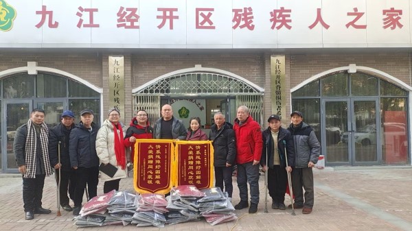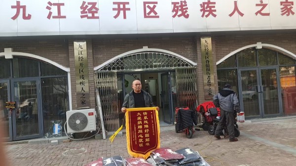 活动现场,九江经开区残疾人协会负责人王主席及班子成员代表接受了捐赠,并向易桂莲、刘敏,两位爱心人士颁发感恩锦旗,以此致谢他们对残疾人群体的关怀与助力。九江市红色文化促进会会长詹冬龙及协会会员也到场参与活动,共同见证这场跨越群体的爱心传递。