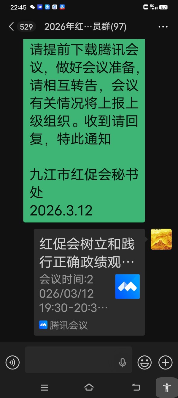 3月12日,九江市红色文化促进会以高效务实、迅速响应的工作作风,第一时间落实上级关于树立和践行正确政绩观学习教育的部署要求。当日下午,会长兼党总支书记詹冬龙、支部书记张广海专程参加市文广旅局行业综合党委组织召开的工作部署会,认真学习领会会议精神。当晚19时30分,促进会立即创新采用"微信九宫格会议+腾讯会议"双线并行形式,在会员群召开专题线上会议,两个会场共计30余名骨干成员参会,以雷厉风行、立说立行的实干作风,第一时间传达学习、研究部署相关重点工作。