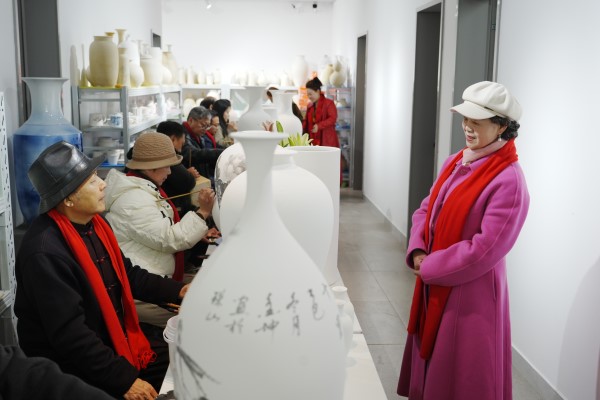 中国陶瓷艺术大师秦晓明,学院教授汪有明、胡强,中国工艺美术大师曹爱琴,还有万清容、秦志成、金呈鹏以及秦龙总导演等艺术家们,纷纷执笔蘸墨,俯身于坯前,宛如一群技艺高超的舞者,在素坯的舞台上尽情挥洒着艺术的激情。他们的笔触或轻盈飘逸,如春风拂过湖面;或刚劲有力,似金戈铁马奔腾。每一笔、每一划,都倾注着对陶瓷艺术的热爱与执着。