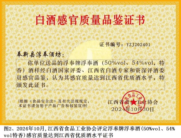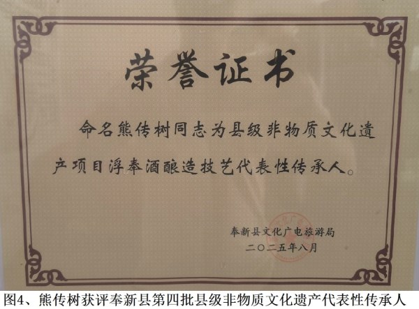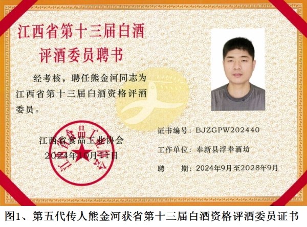 匠心传承,后继有人。熊传树的儿子熊金河秉承家风,诚信做人、良心酿酒,在父亲的传帮带下,酿酒、品酒技艺飞速提升,2024年9月荣获江西省第十三届白酒评委资格并受聘(图1),成为浮奉酒酿造技艺第五代传人,让这份本土酿酒技艺得以代代延续。